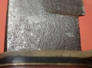 145 MM LONG BLADE WITH HEAVY BROWN PATINA. MAKER MARK NOT VISIBLE, BUT WILL POSSIBLY COME UP IF CLEANED. STAG HORN GRIP WITH ALUMINIUM POMMEL